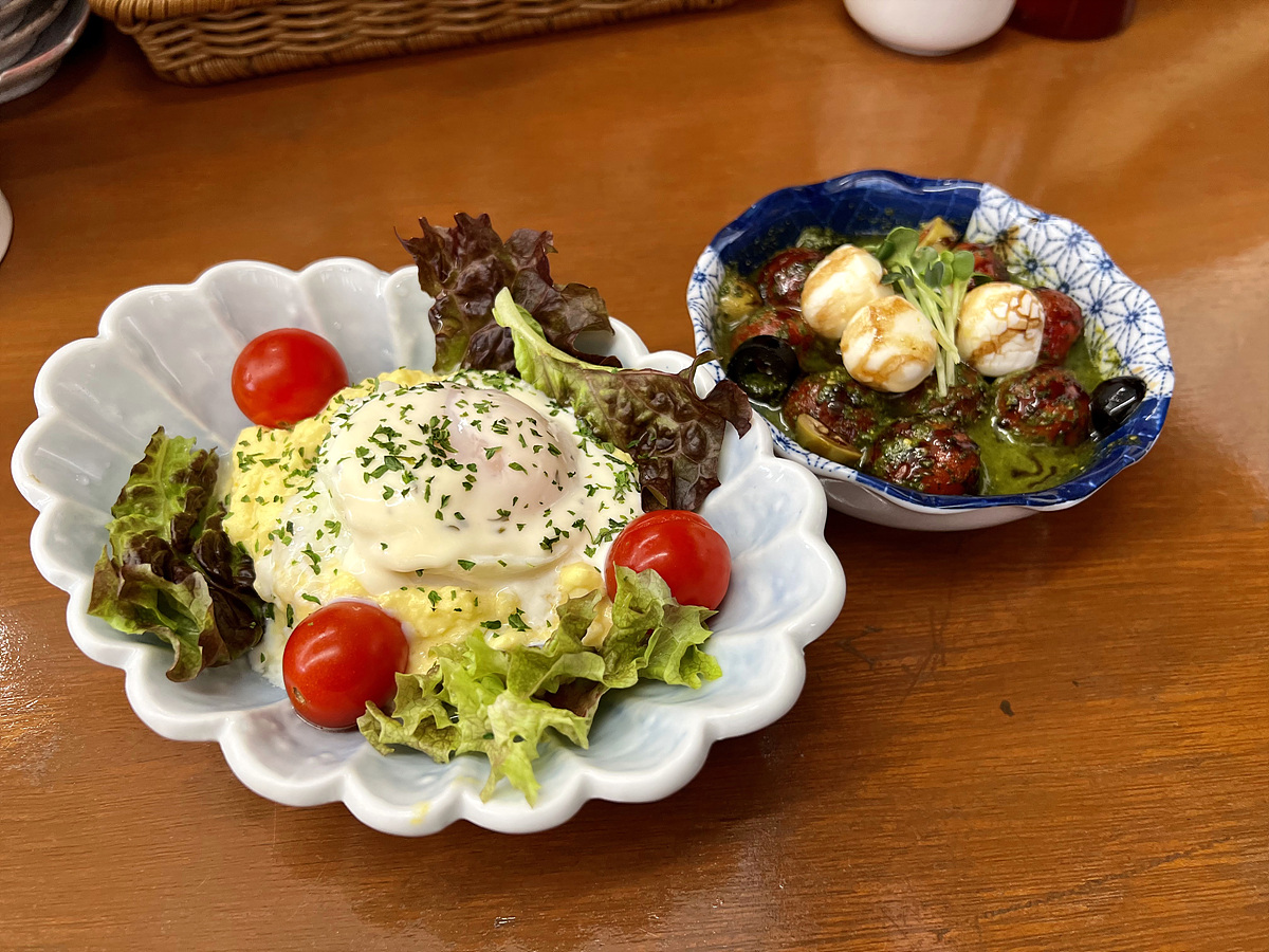 왼쪽의 달걀감자 샐러드는 부드럽고 오른쪽 토마토치즈 샐러드는 상큼하다..