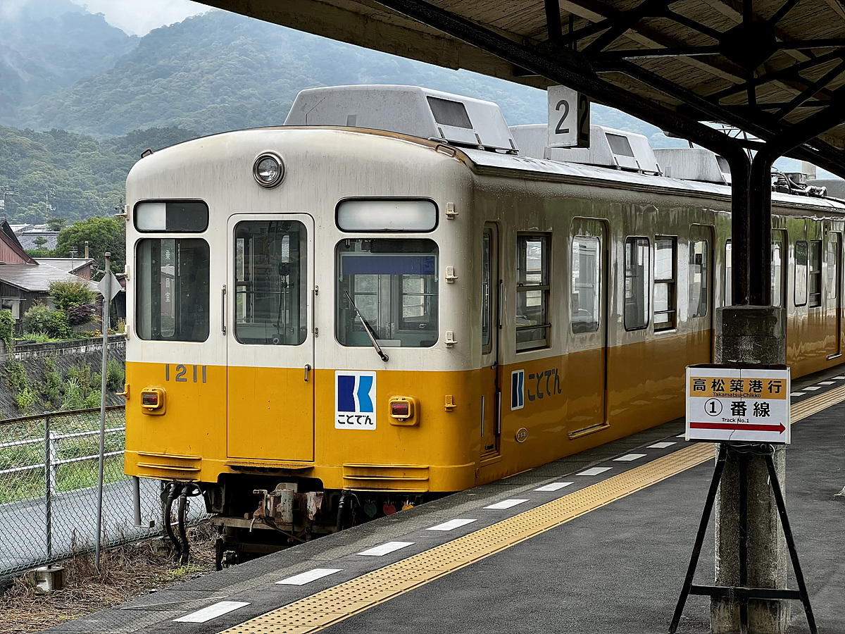 다카마쓰로 가는 고토덴이 출발하는 고토덴 고토히라역..