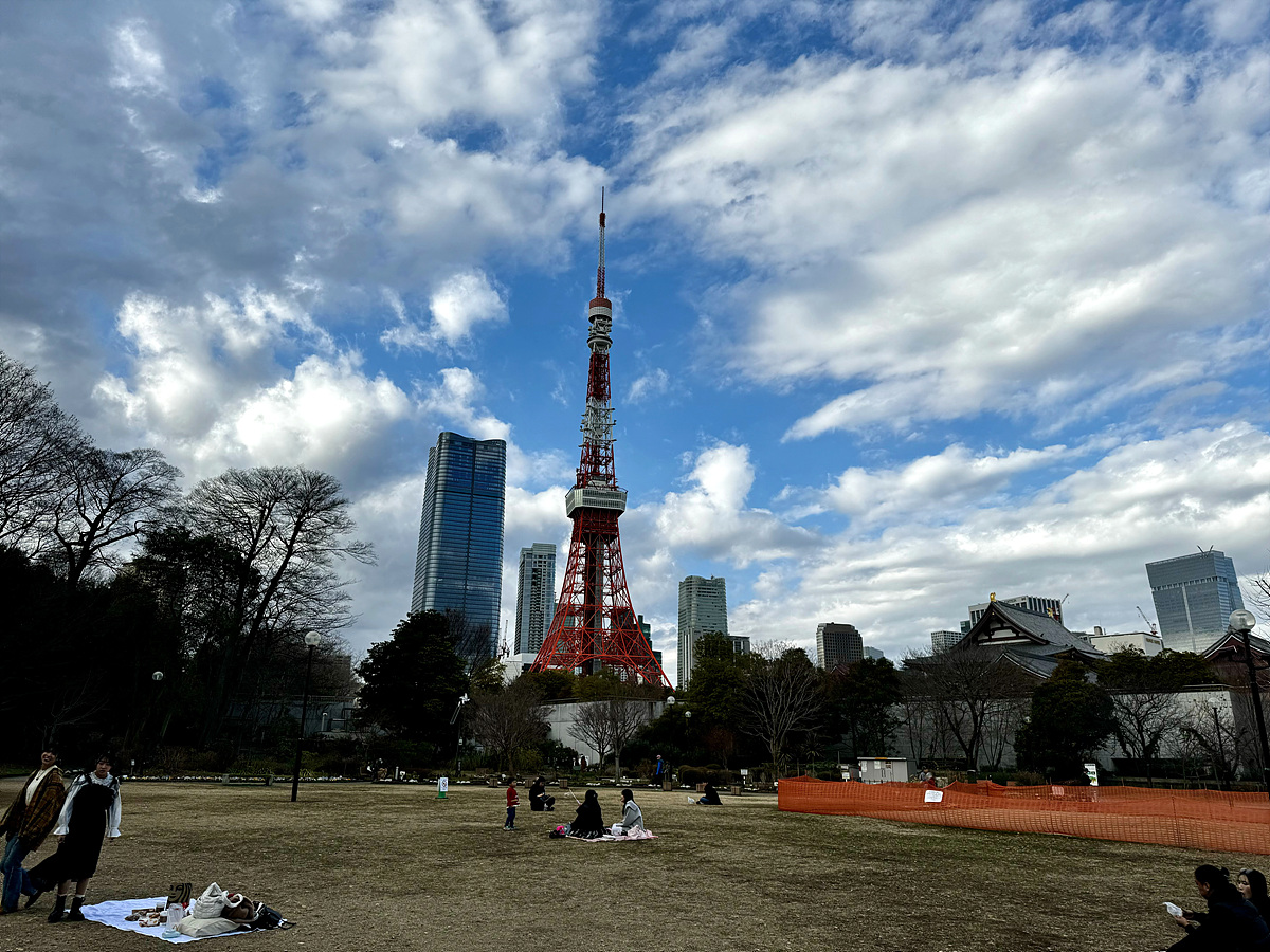 많은 사람들이 도쿄타워를 바라보며 쉬는 프린스 시바공원..