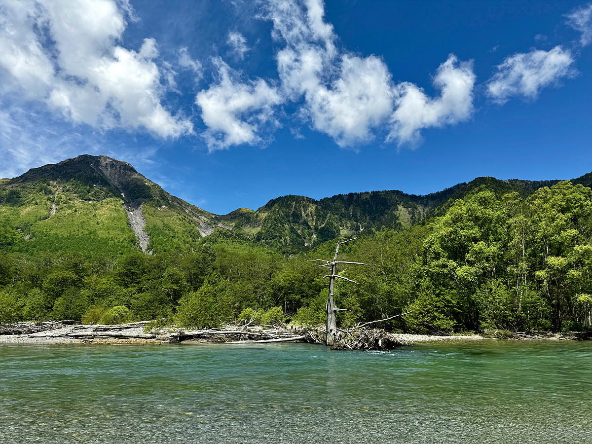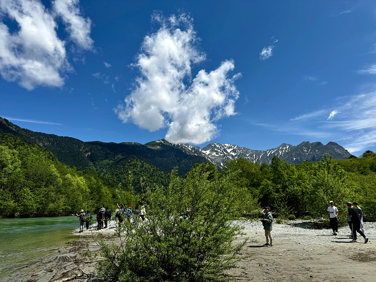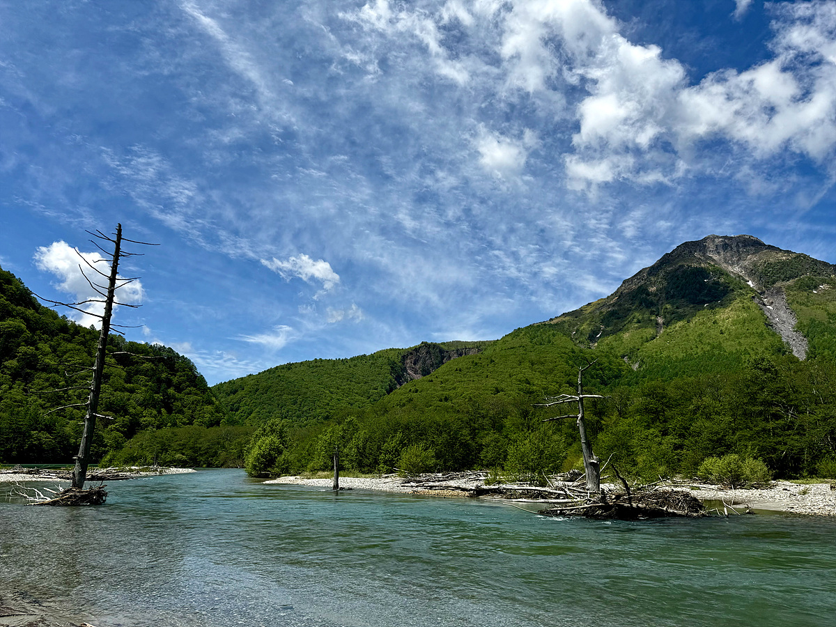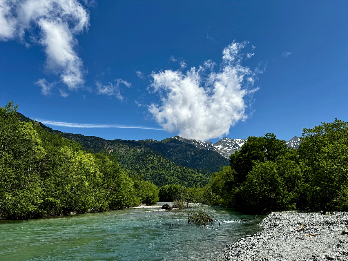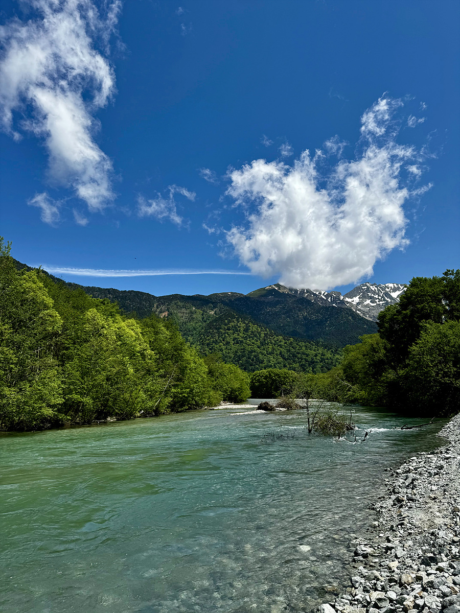 트레일은 왼쪽에 아즈사 강을 두고 숲속으로 이어진다..