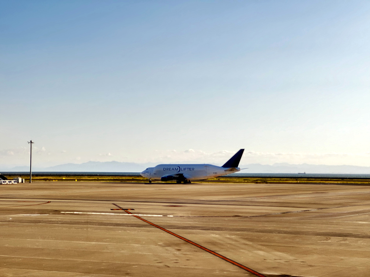 창 밖으로 보잉의 B787 동체를 실어나르는 드림 리프터가 보인다..