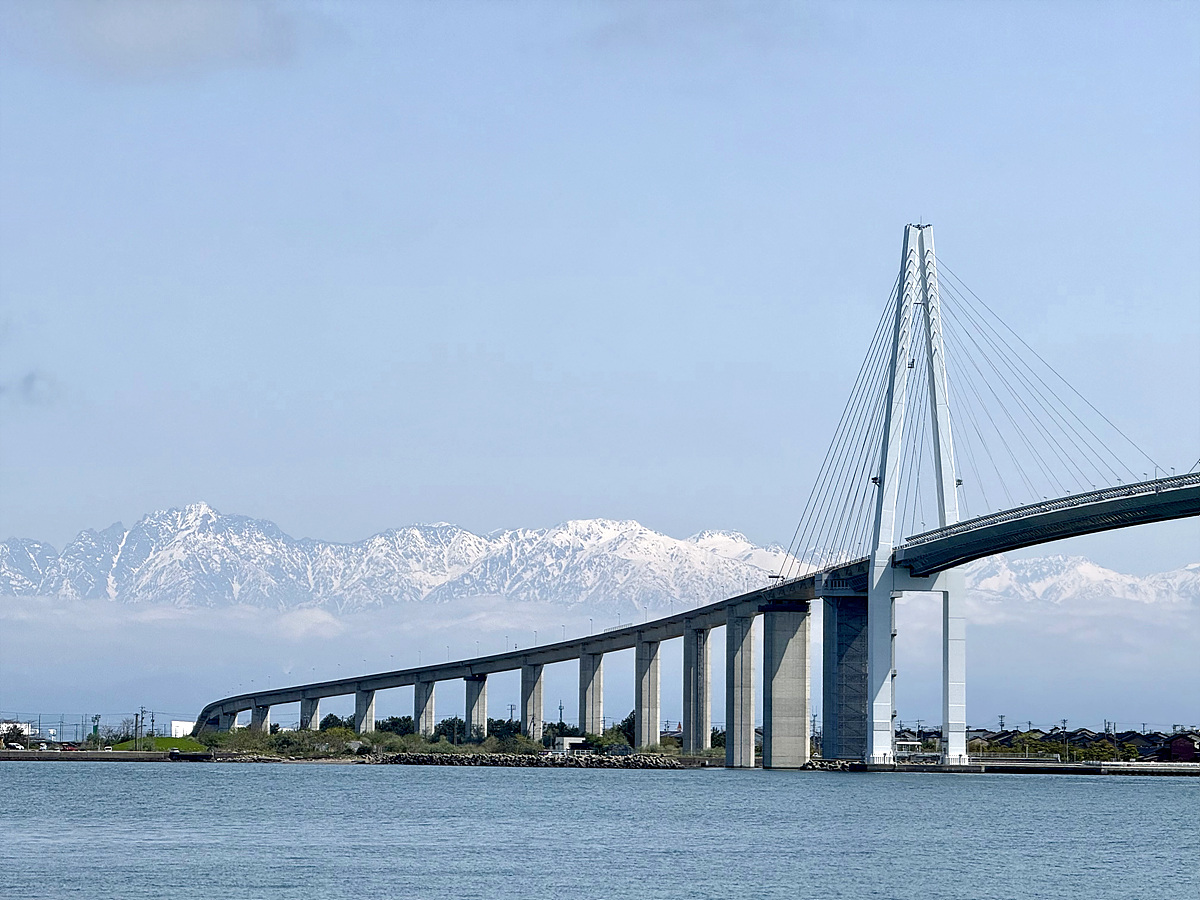 사교인 신미나토 대교의 뒤로 눈덮힌 다테야마 연봉이 보이는 풍경..