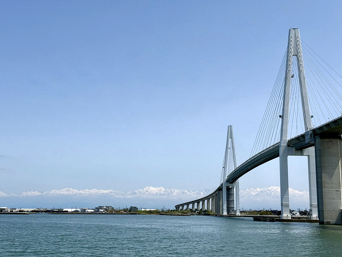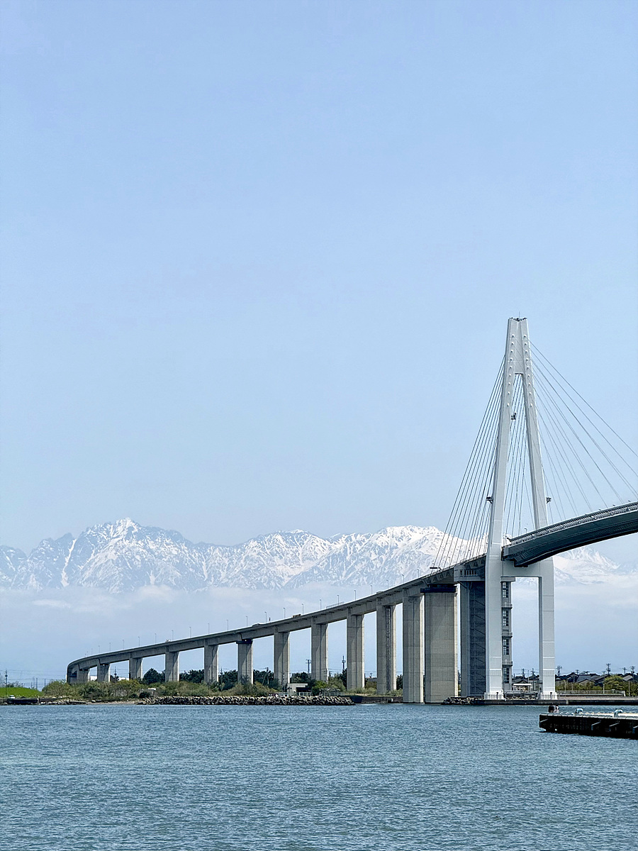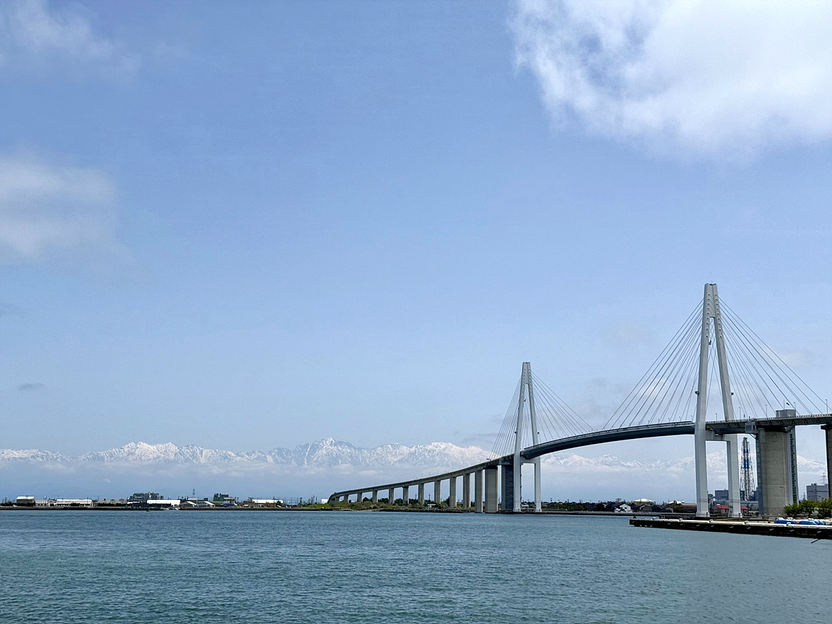 사교인 신미나토 대교의 뒤로 눈덮힌 다테야마 연봉이 보이는 풍경..