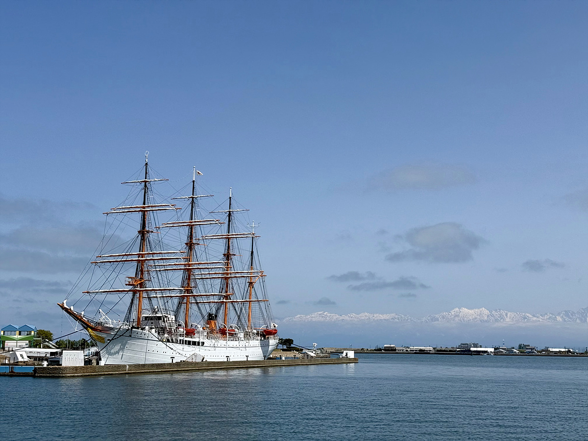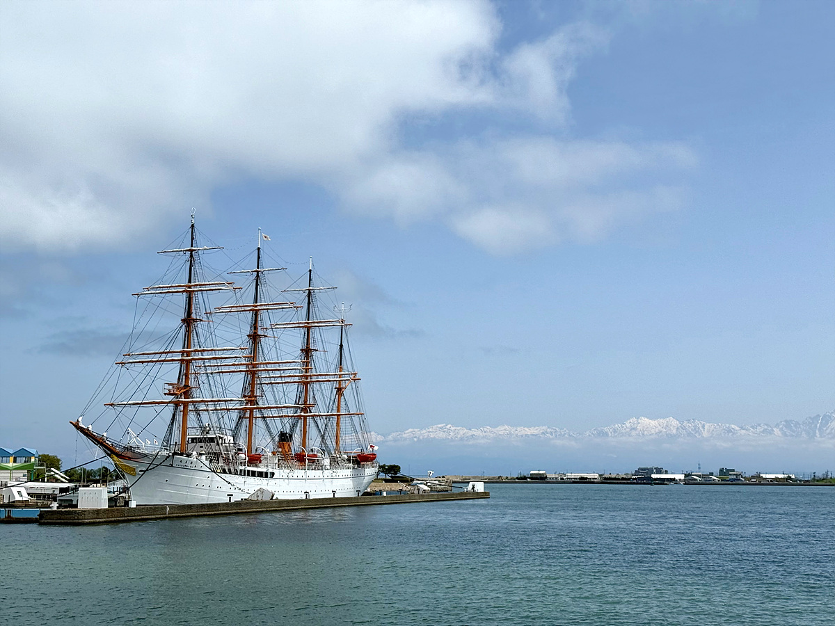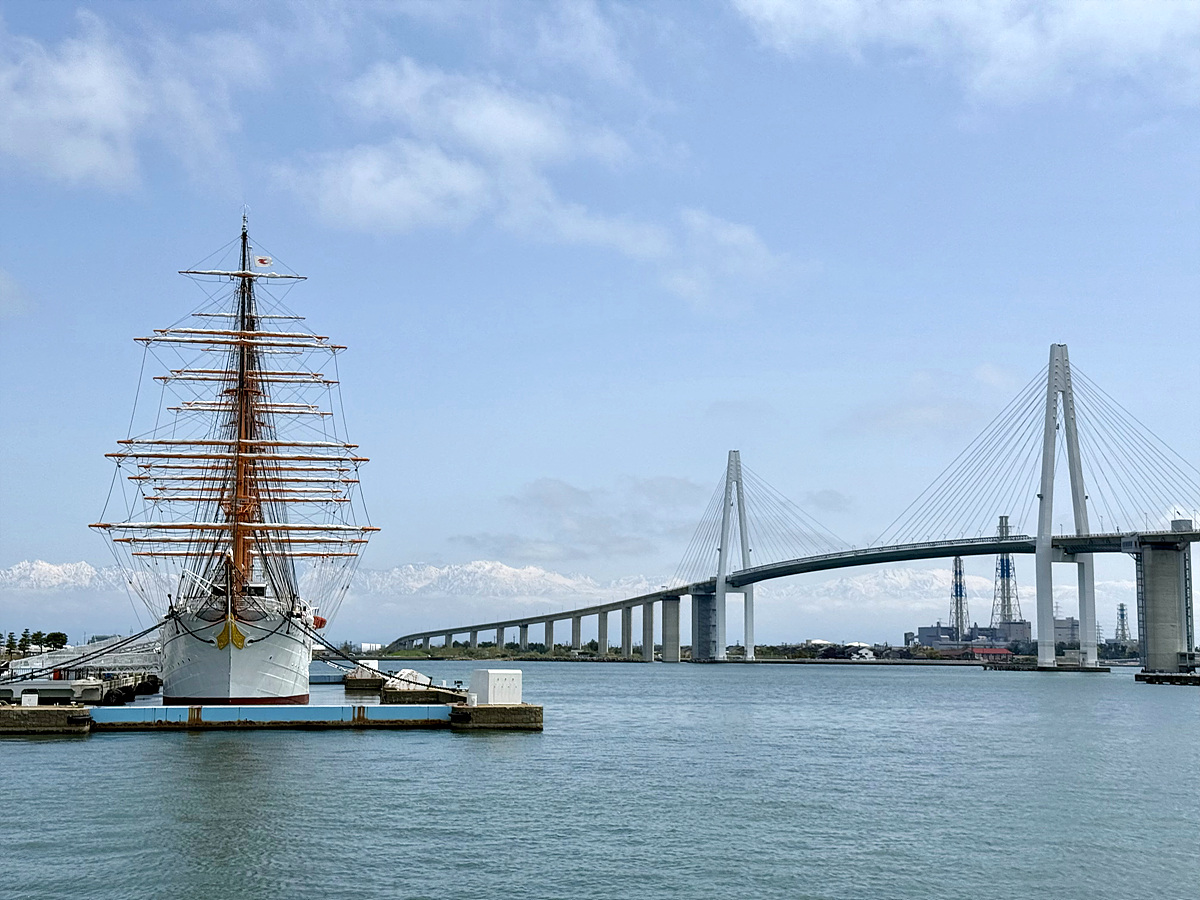 사교인 신미나토 대교의 뒤로 눈덮힌 다테야마 연봉이 보이는 풍경..
