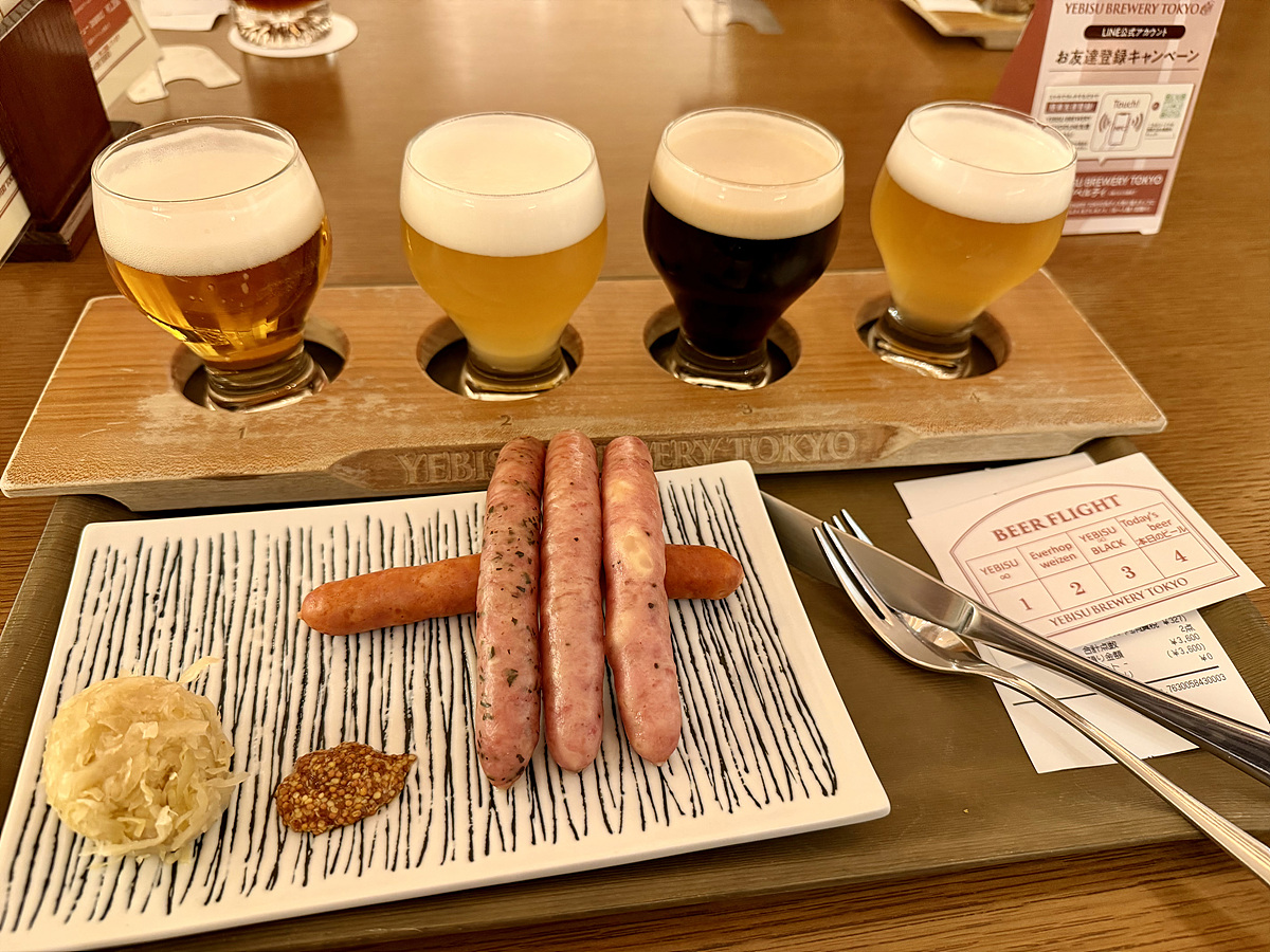 오전 일정 후 점심은 에비스 가든 플레이스에 있는 에비스 브루어리 도쿄에서 맥주 샘플러와 간단한 안주로..
